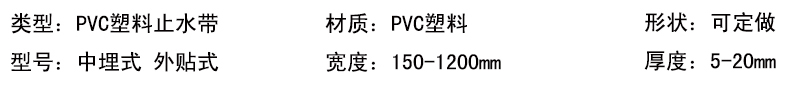 2.PVC塑料止水带适用范围:主要用于混凝土浇注时设置在施工缝及变形缝内与混凝土构成为一体的基础工程。如隧道、涵洞、引水渡槽、拦水坝、贮液构筑物、地下设施等。塑料止水带充分利用聚氯乙烯树脂具有的弹性变形特性在建筑构造接缝中起到防漏、防渗作用,且具有耐腐蚀、耐久性好的特点。