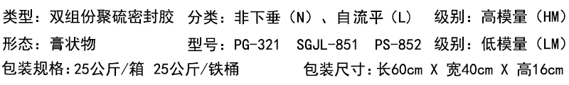 1.聚硫密封胶按照组份分为:单组份;双组份;流淌样式分类:a、按照流动性可分为非下垂型(N)和自流平型(L)两个类型;按照位移能力可分为25、20两个级别;按照拉伸模量可分为高模量(HM)和低模量(LM)两个次级别。