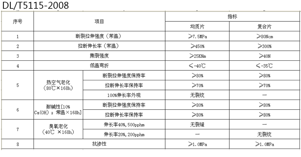 2.三元乙丙防渗保护盖板特点:(1)塑性防渗适应基面变形性强:三元乙丙防渗保护盖板是由柔性止水材料和增强型聚酯布复合而成的, 与 混凝土基面粘结的是GB(SR)柔性填料,当混凝土基面变形时,柔性填料发生塑性变形,从而避免三元乙丙防渗保护盖板受到应力破坏;(2)抗拉强度高:利用三元乙丙防渗保护盖板内加强筋的增强作用,使其抗拉强度达到并超过1cm厚橡胶板的强度值,这样既可节约成本,又使得施工更加方便,防渗质量得以保证;(3)抗撕裂、抗冲击性好:由于有加强筋的增强作用,三元乙丙防渗保护盖板具有比纯橡胶片更好的抗撕裂、抗冲击破坏性能;(4)与柔性填料及混凝土面粘结效果好:衡水恒创建工材料有限公司生产的三元乙珍防渗保护盖板上复合有柔性填料,可与混凝土基面粘合密封,均匀传递水压力,实现了很好的防渗密封效果;